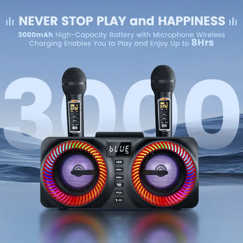 • La batterie rechargeable de 3000 mAh vous offre jusqu’à 5h d’autonomie sonore pour des chants ininterrompus.