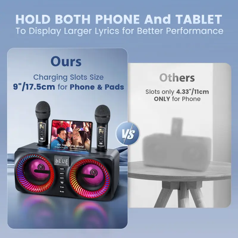 • Le poste karaoké autonome intègre un support de tablette, une connexion Bluetooth de 36m, USB, carte TF et entrée AUX.